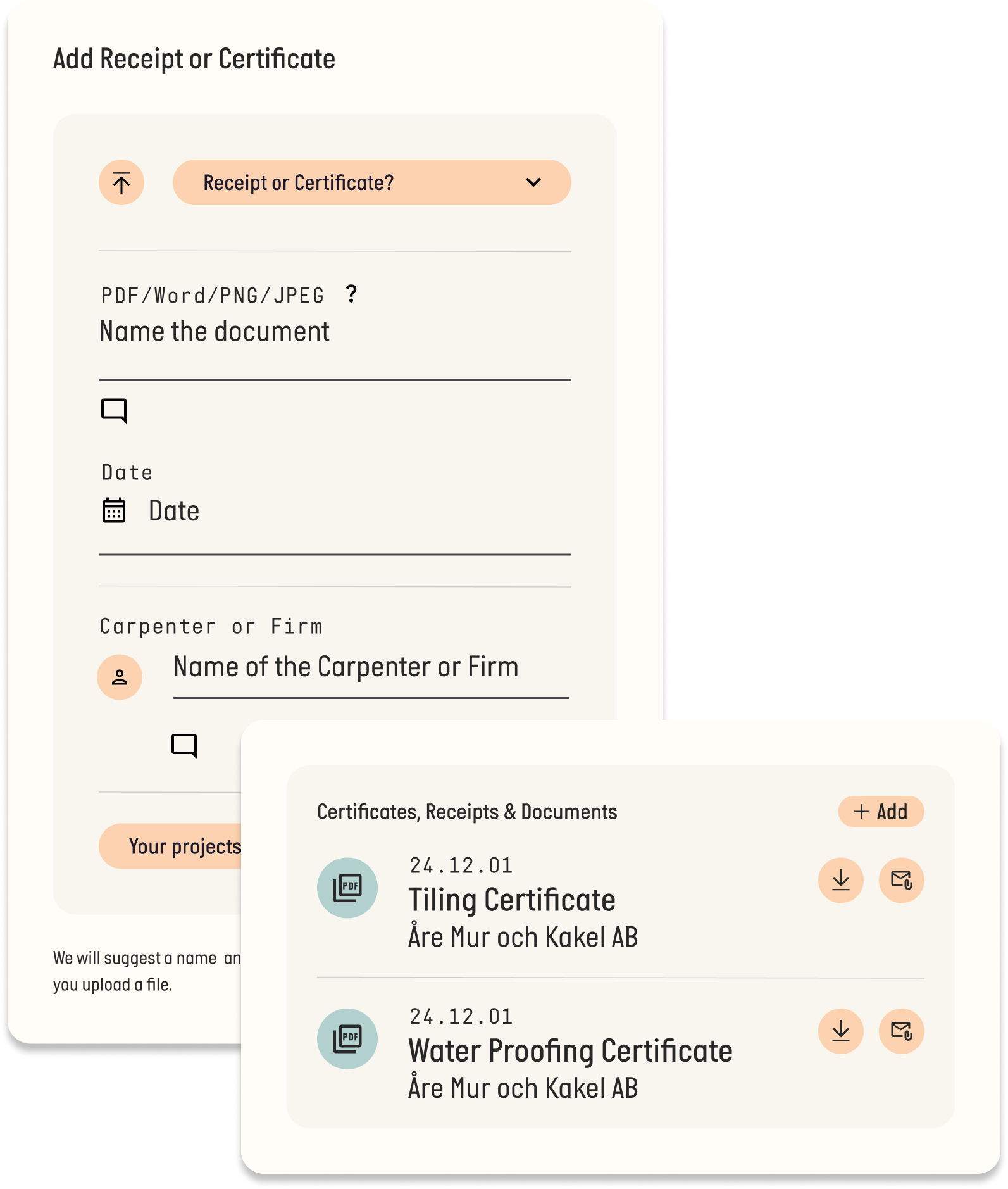 Buildapp offers a secure, blockchain-based solution for storing all renovation documents; certificates, warranties, receipts, photos and more, all linked to each property through unique real-estate identifiers (such as Lantmäteriet in Sweden). Both homeowners and contractors can upload and access files directly in the app, ensuring everything is safely stored, easily searchable and permanently tied to the property rather than the individual.