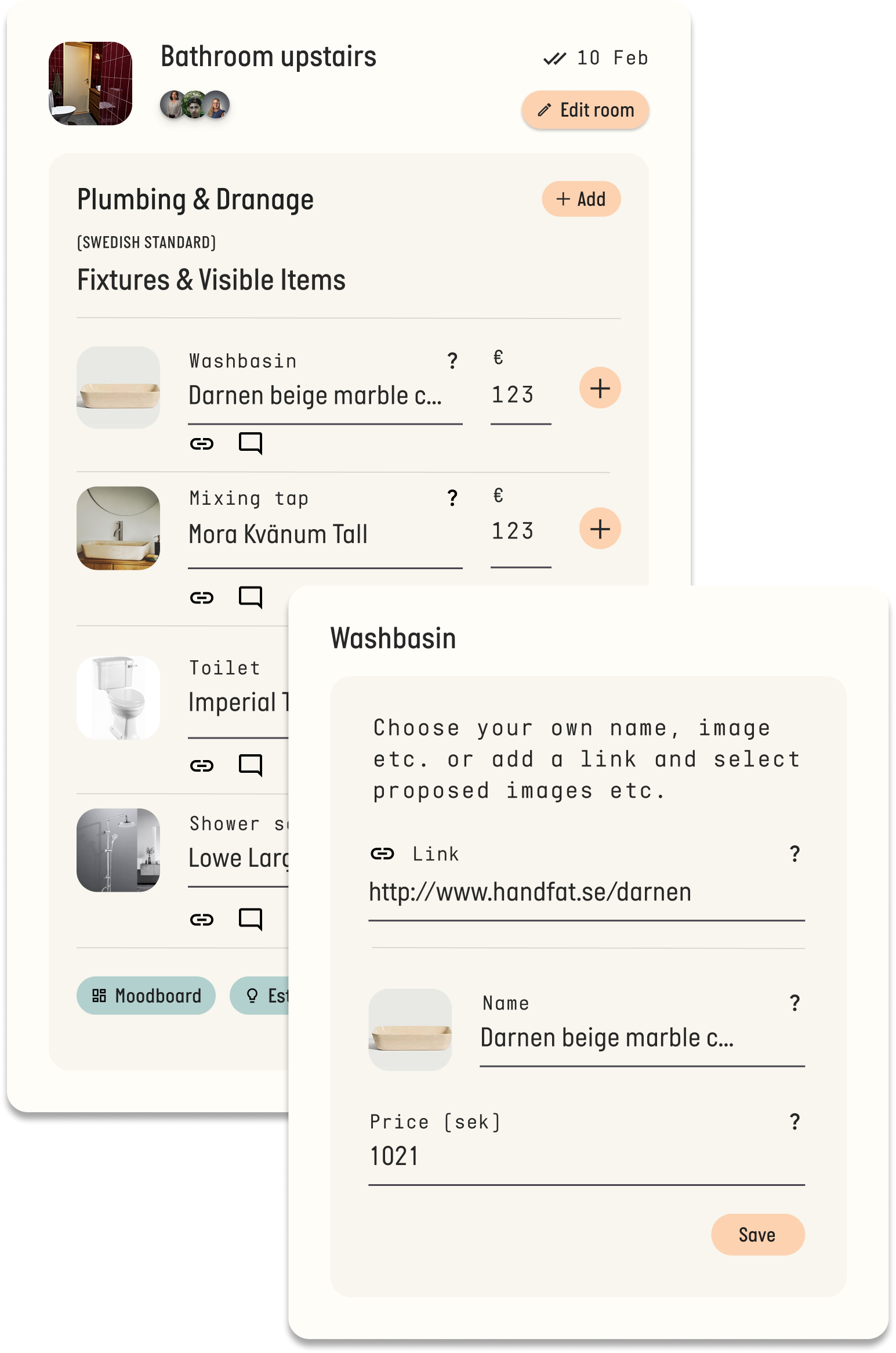 Create stunning Moodboards directly in the app by selecting real materials, fixtures, and finishes. Experiment with styles, swap out tiles or taps, and invite your family to view and vote on the final look.
