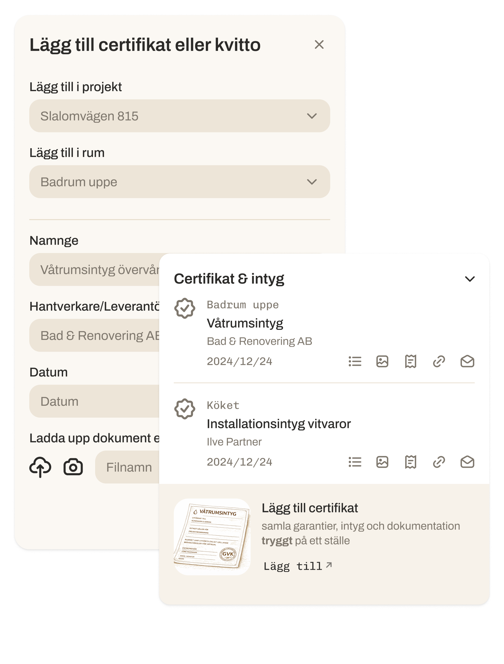 Add products, materials, manuals, photo documentation, certificates and receipts as the renovation progresses.